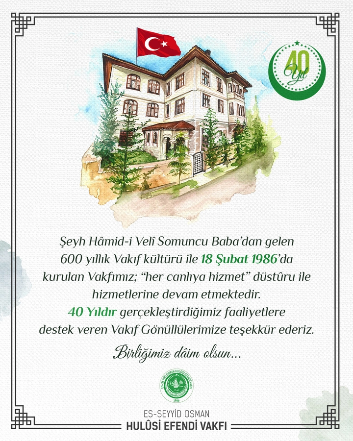 "Şeyh Hâmid-i Velî Somuncu Baba Hazretleri'nden tevarüs eden 600 yıllık vakıf irfanı üzerine, 18 Şubat 1986 tarihinde temelleri atılan Vakfımız; 'her canlıya hizmet' düsturunu rehber edinerek hizmet yolculuğunu kararlılıkla sürdürmektedir. Kırk yıl boyunca yürüttüğümüz hayır ve hizmet faaliyetlerine gönülden destek veren tüm Vakıf Gönüllülerimize şükranlarımızı sunuyoruz. Muhabbetimiz, birliğimiz ve kardeşliğimiz daim olsun…"