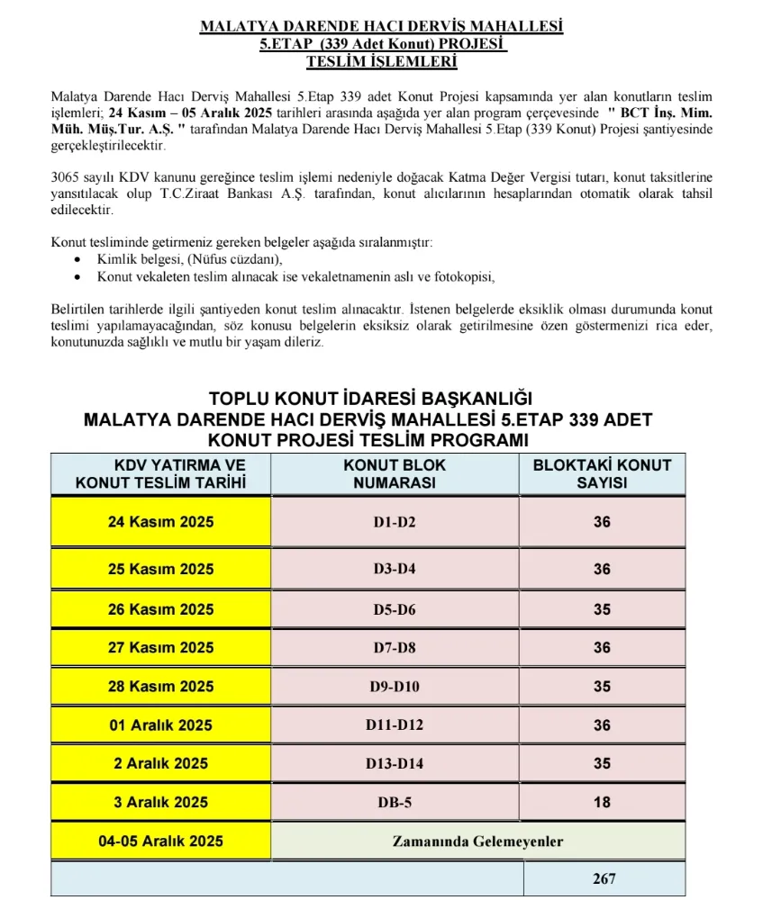 Konutların teslimi, yüklenici firma BCT İnş. Mim. Müh. Müş. Tur. A.Ş. tarafından yürütülürken, 3065 sayılı KDV Kanunu gereğince doğacak verginin Ziraat Bankası tarafından hak sahiplerinin hesaplarından otomatik olarak tahsil edileceği belirtildi.