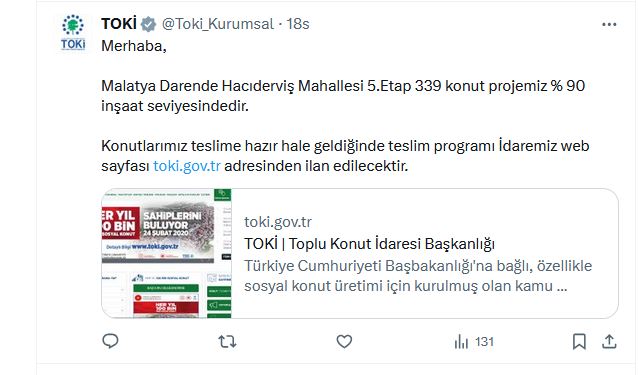Bir vatandaşın başvurusu üzerine TOKİ’den yapılan açıklamada, 339 konuttan oluşan projede çalışmaların, 25 Eylül itibariyle yüzde 90 seviyesine ulaştığı belirtildi. Açıklamada, “Konutlarımız teslime hazır hale geldiğinde teslim programı İdaremiz web sayfası toki.gov.tr adresinden ilan edilecektir.” denildi.