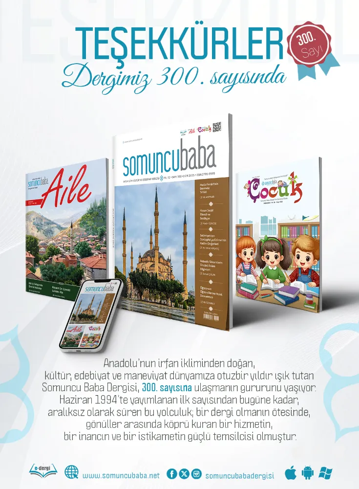 “Somuncu Baba Dergisi, 31 yıldır Anadolu’nun hikmet dolu sesini kelimelere taşıyor. Her sayısında emeği bulunan yazarlarımıza, editörlerimize, sanatkârlarımıza, okuyucularımıza ve destek veren tüm gönül dostlarımıza teşekkür ediyoruz. Bu başarıyı bir sayı değil, yeni bir başlangıç olarak görüyor; inançla, irfanla ve ilimle hizmet etmeye devam ediyoruz.”