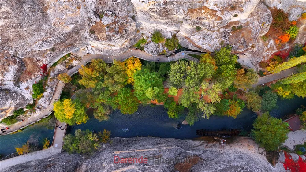 Hafta sonlarını huzurlu bir ortamda geçirmek isteyen vatandaşlar, sarmaşıkların kızıl ve sarı tonlarına büründüğü kanyonda yürüyüş yaparak sonbaharın keyfini çıkarıyor.
