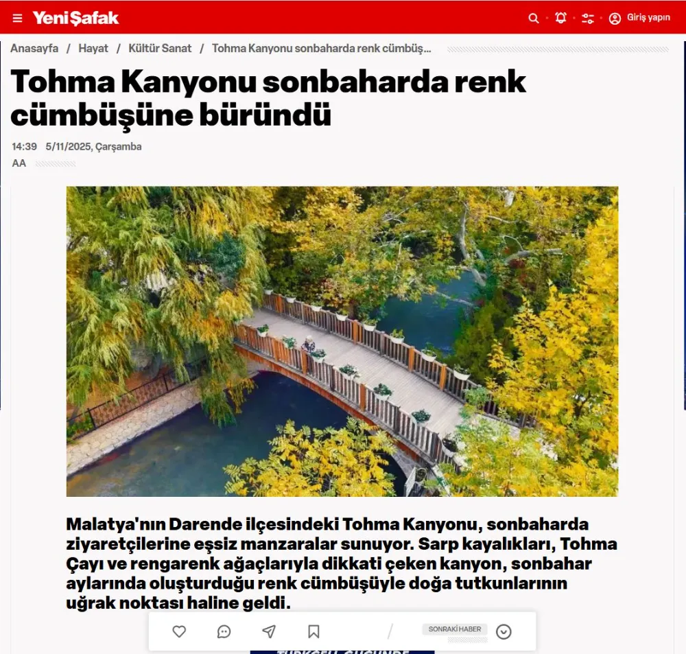 Öte yandan, Tohma Kanyonu’nun sonbahar güzelliğini konu alan haberimiz, Anadolu Ajansı’nın manşetinde geniş yer buldu. Haberde, kanyonun tarihi dokusu, Tohma Çayı’nın eşsiz manzarası ve sonbaharın tüm renkleriyle buluştuğu doğal atmosferiyle ziyaretçilerini büyülediği vurgulandı.